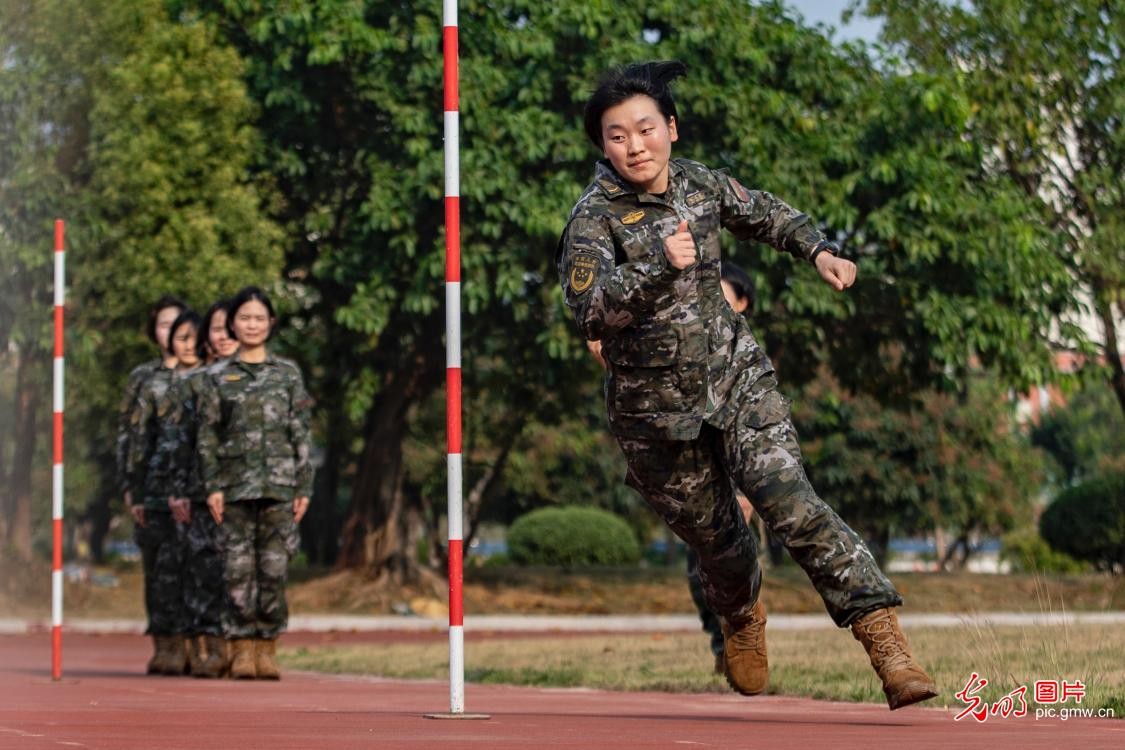 2023年3月24日,武警广西总队参谋部通信大队组织某中队女兵开展信息通信全要素演练、基础体能、擒敌基础动作等多种课目的强化训练,进一步提高女兵军事训练水平和业务能力,为下步遂行多样化任务奠定基础。图为武警女兵进行腿法训练。(余海洋摄/光明图片)