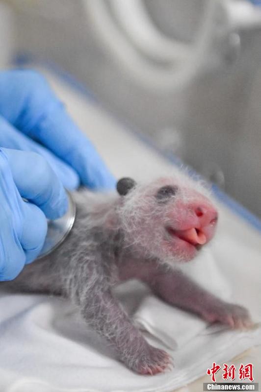 大熊猫“隆隆”诞下的幼崽在保育箱内接受身体检查。