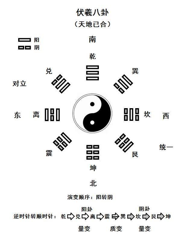 乾南坤北为天地定位,坎离定东西。艮西北方,兑东南方,为山泽通气;震东北方,巽西南方,为雷风相博;坎西方离东方为水火相射。自巽到坤为逆,自震到乾为顺,六十四卦也是依次演化而来。