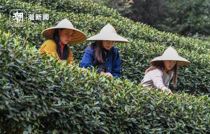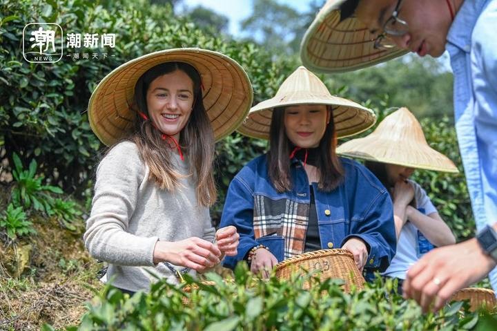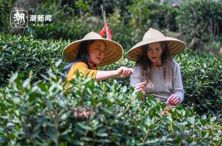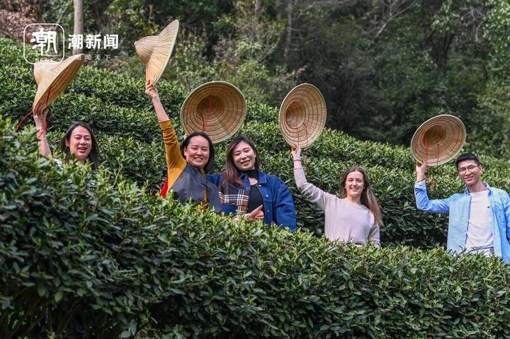 3月23日,杭州梅家坞的龙井茶园里,村民袁莉娜正在教外国客人学采茶。
