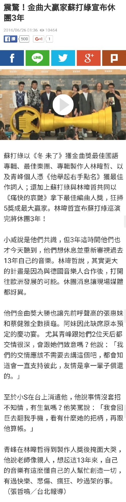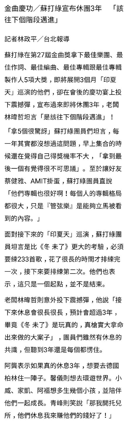 在27届台湾金曲奖苏打绿成最大赢家,获得五个奖项,庆功宴上苏打绿宣布休团三年,粉丝纷纷表示太难接受。