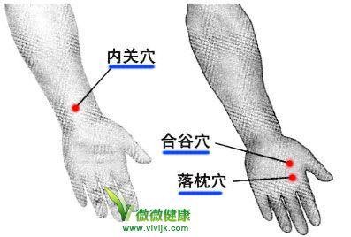 2、接下来以相同的方法按摩两手手腕内侧的内关穴,力度可渐渐加大,每个穴位正时针按摩50圈(如果是出现左边的脖子落枕,则按右边的内关穴,同样,右边落枕则按左内关穴)。