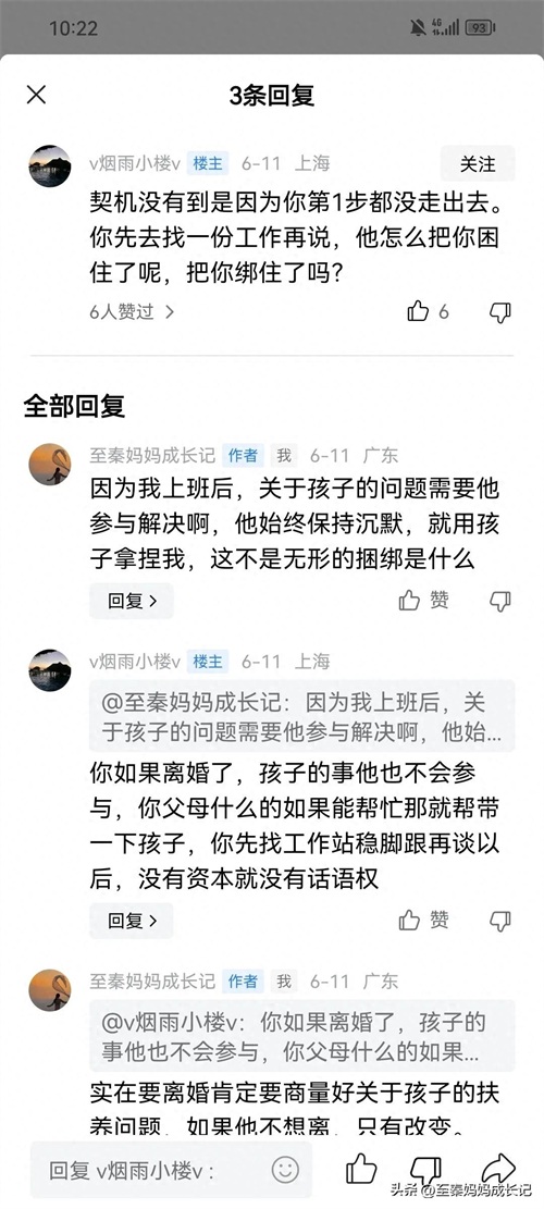 我们的家庭情况是没有任何人能帮我们带孩子的,我只能自己带,早些时候,我说让孩子去幼儿园,我去上班,但孩子爸爸沉默,我也没找到能带着孩子一起上班的工作,故而作罢。