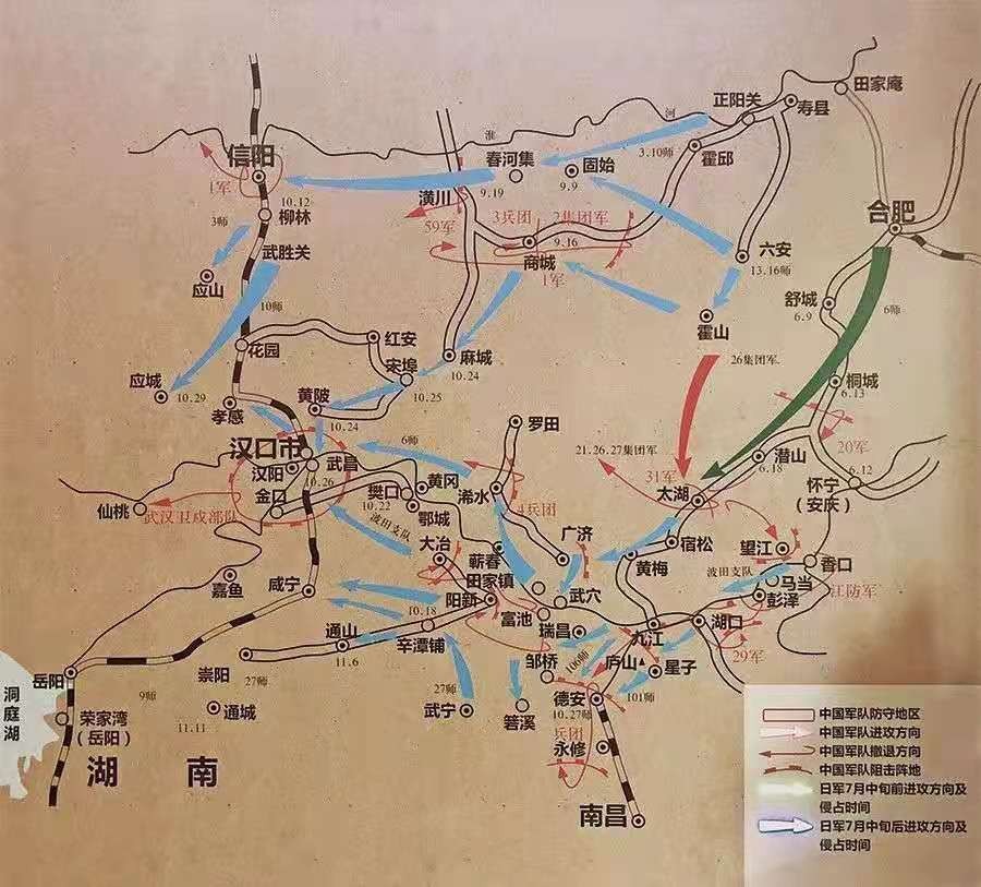 1938年6月11日,日军以华中派遣军为主力,30万人进攻武汉。中国方面则是以李宗仁、白崇禧的第五战区以及陈诚、薛岳的第九战区,共计60万大军应战。战斗范围扩及安徽、江西、湖北、河南四个省份。