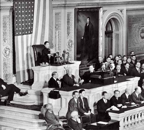 1941年,美国时间12月7日清晨开始,日本海军出动6艘航空母舰、300多架飞机突袭珍珠港。美军战舰、巡洋舰与驱逐舰共计14艘被击沉或重创,同时有188架飞机被炸毁,超过3600人伤亡,迫使12月8日美国对日本宣战,加入同盟国。中国也顺势在9日向日本宣战,加入同盟国。12月10日,中国也向德国、意大利宣战。中国独立抗战至此已经撑了四年半,终于有了盟友。蒋介石也由盟军推举为中国战区最高统帅。