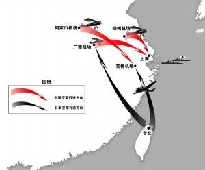 空军部分,国民政府军先以向美、苏、意购买的各式飞机轰炸日本海军陆战队司令部,日军旗舰“出云号”也受到了重创。日本则是派遣18架九六式轰炸机,从台北松山机场起飞,对杭州笕桥空军基地及安徽广德机场展开反击,迫使驻守笕桥的四大队紧急升空迎战,形成了著名的“笕桥空战”。