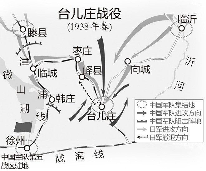 中国全力撤往西南,日本也加快步调,串联华东、华北两战场,进攻徐州。可是日军却在徐州这一仗吃足了苦头。初期,日军兵分三路:一路循津浦铁路(天津-南京浦口)北上,遭遇桂军李品先的第11集团军和廖磊的第21集团军等部队,双方僵持在蚌埠;另外一路日军从青岛登陆,在临沂被西北军孙桐萱的第3集团军、孙震的第22集团军击退;第三路日军沿津浦线南下,川军死守滕县三天三夜,整个122师官兵战死沙场。3月份,会战进入第二阶段。日军准备直取徐州东北方的门户——台儿庄,却在临沂遭到庞炳勋的第40军和张自忠的第59军的顽强抵抗。日军攻下滕县后,直攻台儿庄,与守军池峰城的31师血战十天。国军派遣汤恩伯的第20军团与孙桐萱的第3集团军两面包夹,日军陷入重围,竟致溃不成军。