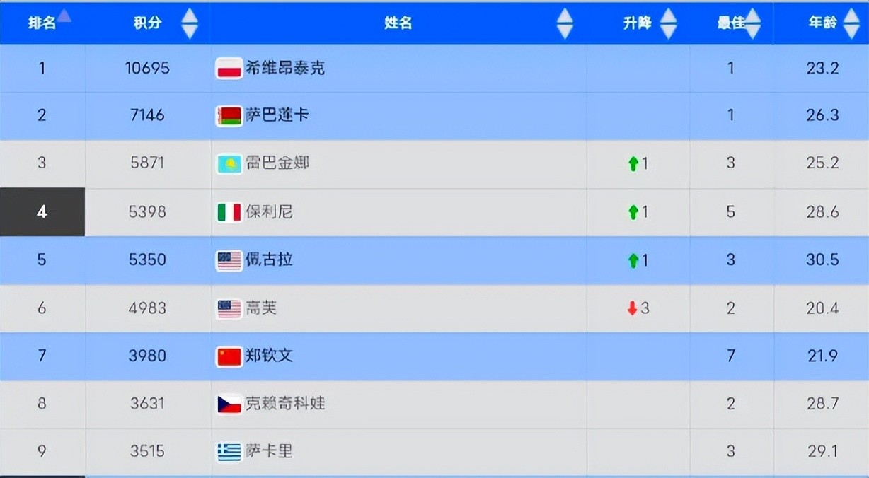 女子网坛最新世界排名:斯瓦泰克第1 萨巴伦卡第2 高芙第6 郑钦文第7