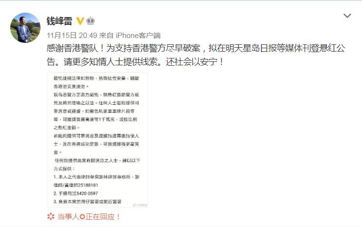 11月15日,钱峰雷遇袭后首发声,表示愿出1000万协助警方缉拿凶手。