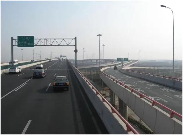 虹桥综合交通枢纽快速集散系统作为服务于枢纽旅客集散的专用快速通道,主要采用全封闭的快速路形式,并通过建虹高架路、虹渝高架路、虹翟高架的三条高架衔接道路与一纵两横快速路网的 4 个立交节点直接相连,即崧泽立交、徐泾中路立交、北翟路立交以及沪青平立交,为进、离场的车辆提供快速通道,同时满足南进南出、北进北出、西进西出的交通组织要求。核心区高架总长约24Km,建成时间为2010年。