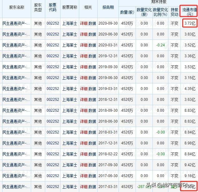 东方财富的信息显示,民生通惠2号在上海莱士,2017年3月起到2020年9月底,三年半时间,持仓数量一直没变化,但因股价下跌,市值从9.3亿元,跌至3.72亿元,腰斩。