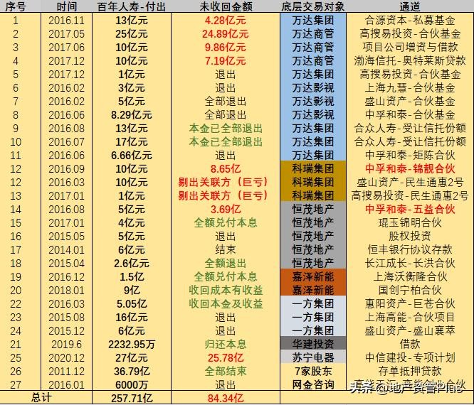 在这些交易中,百年人寿出资总金额约257.71亿,初步确认:尚未收回的金额是,84.34亿。