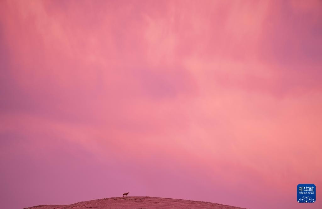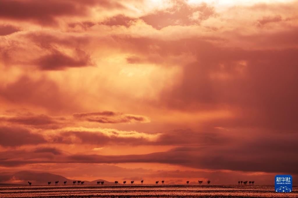 6月15日清晨雪后,在羌塘国家级自然保护区,迎着朝霞前行在迁徙路上的一群藏羚羊。