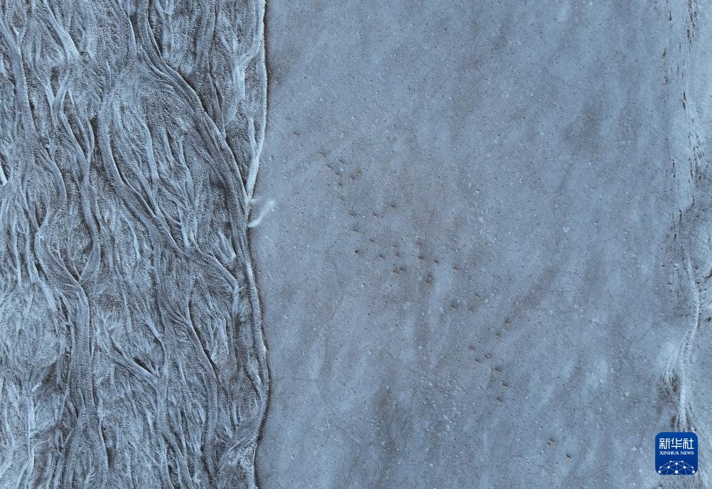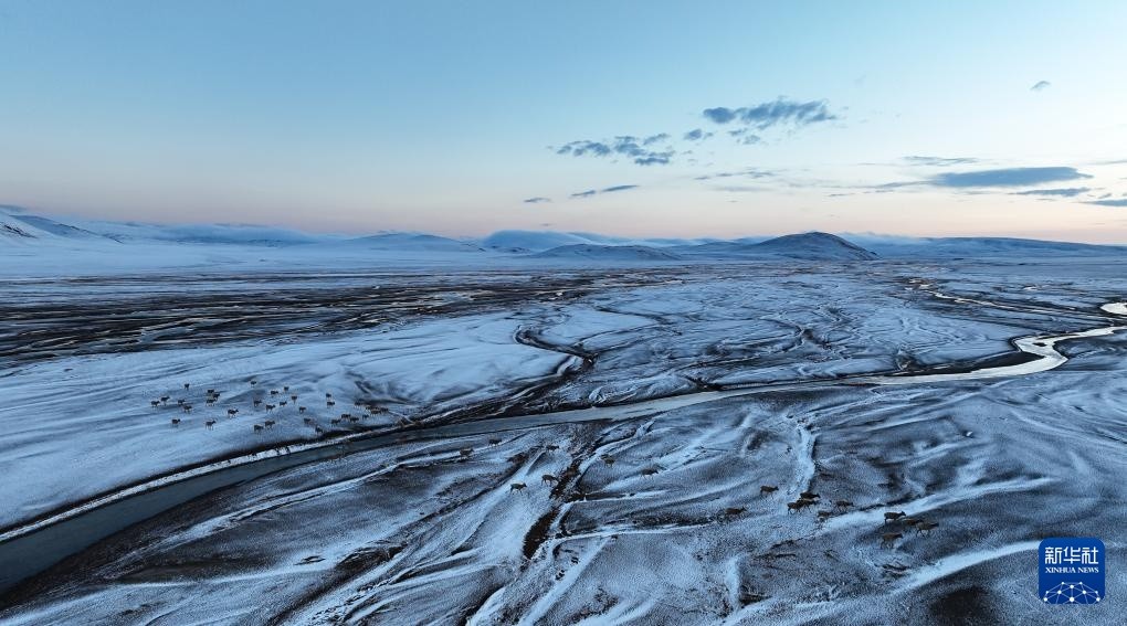 在甜水河畔荒滩雪地中向产羔地迁徙的藏羚羊(6月15日摄,无人机照片)。