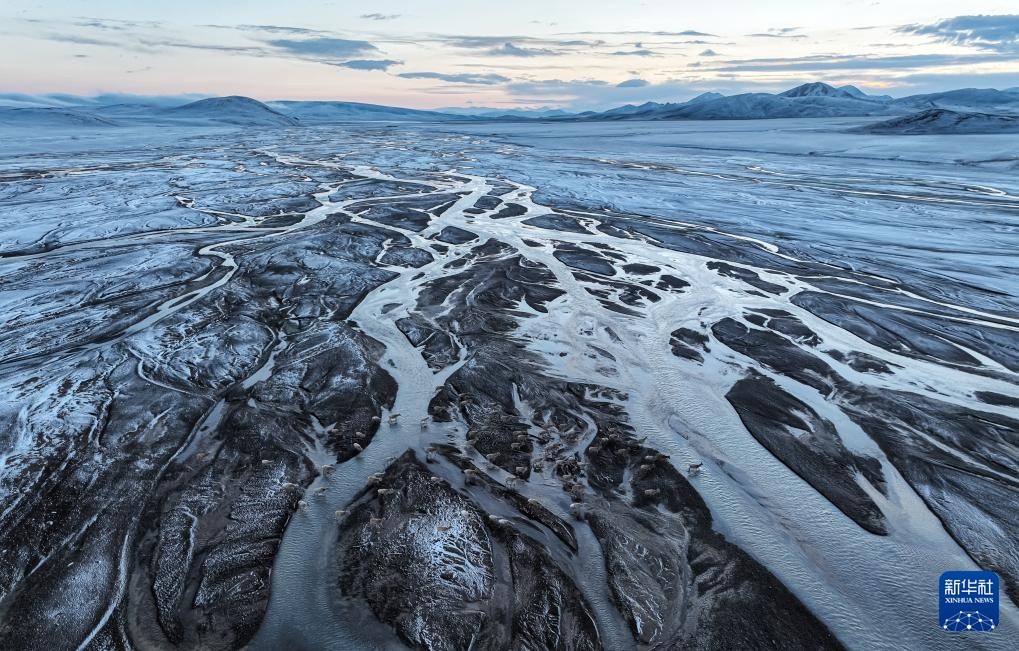 在甜水河畔荒滩雪地中向产羔地迁徙的藏羚羊(6月14日摄,无人机照片)。