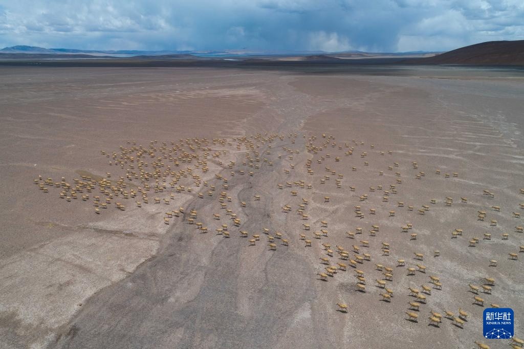 迁徙途中的藏羚羊(6月13日摄,无人机照片)。