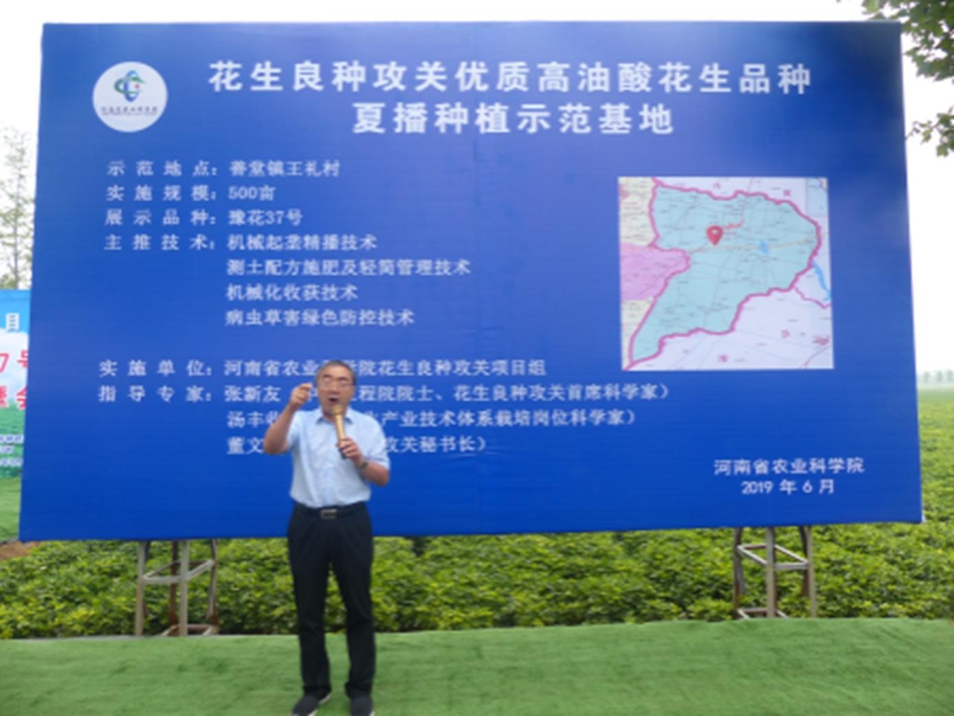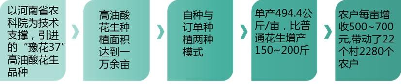 河南丰盛农业开发有限公司2009年成立,2018年以来,河南丰盛农业开发有限公司按照河南省委省政府“四优四化”要求,与河南省农业科学院进行战略合作,突出做好优质花生文章,建立高油酸花生豫花37号繁育基地。2019年,以河南省农科院为技术支撑,公司在善堂镇种植高油酸花生,高油酸花生豫花37号繁育基地面积达到8600亩,采用自种与订单种植两种模式。目前,高油酸花生种植面积达到一万亩左右,高油酸花生单产494.4公斤/亩,比普通花生增产150~200斤。通过推广种植高油酸优质花生,改变了善堂人数百年来沿袭的传统花生种植模式,提升了善堂花生的品质,让种植农户实现了增产增收。