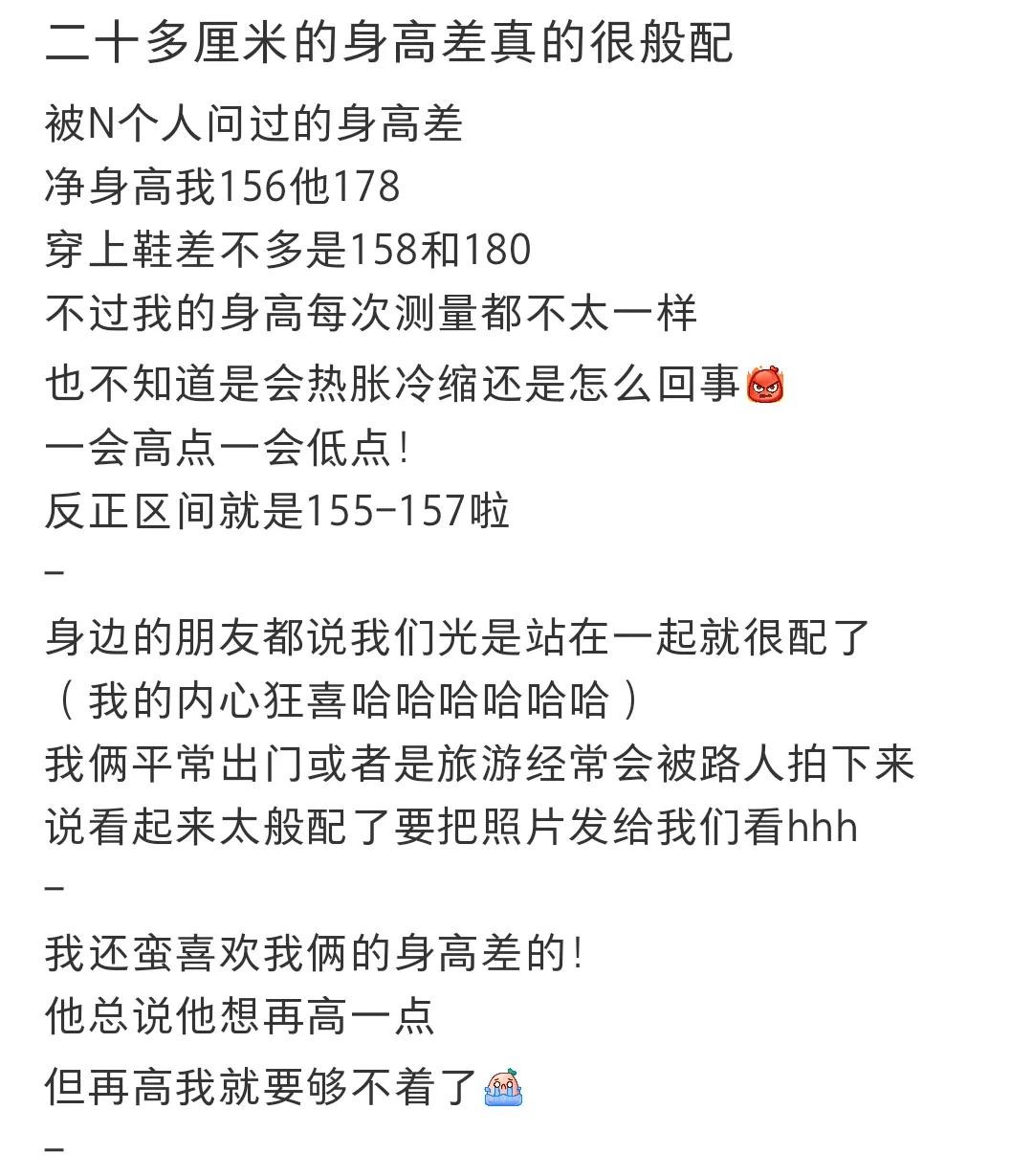 ③20cm对两个来说,是保护欲满满和安全感满满,不止如此,在其他人看来,简直不要太般配,我要是在街上看到这个身高差的情侣,多少也得多看两眼!简直完美。