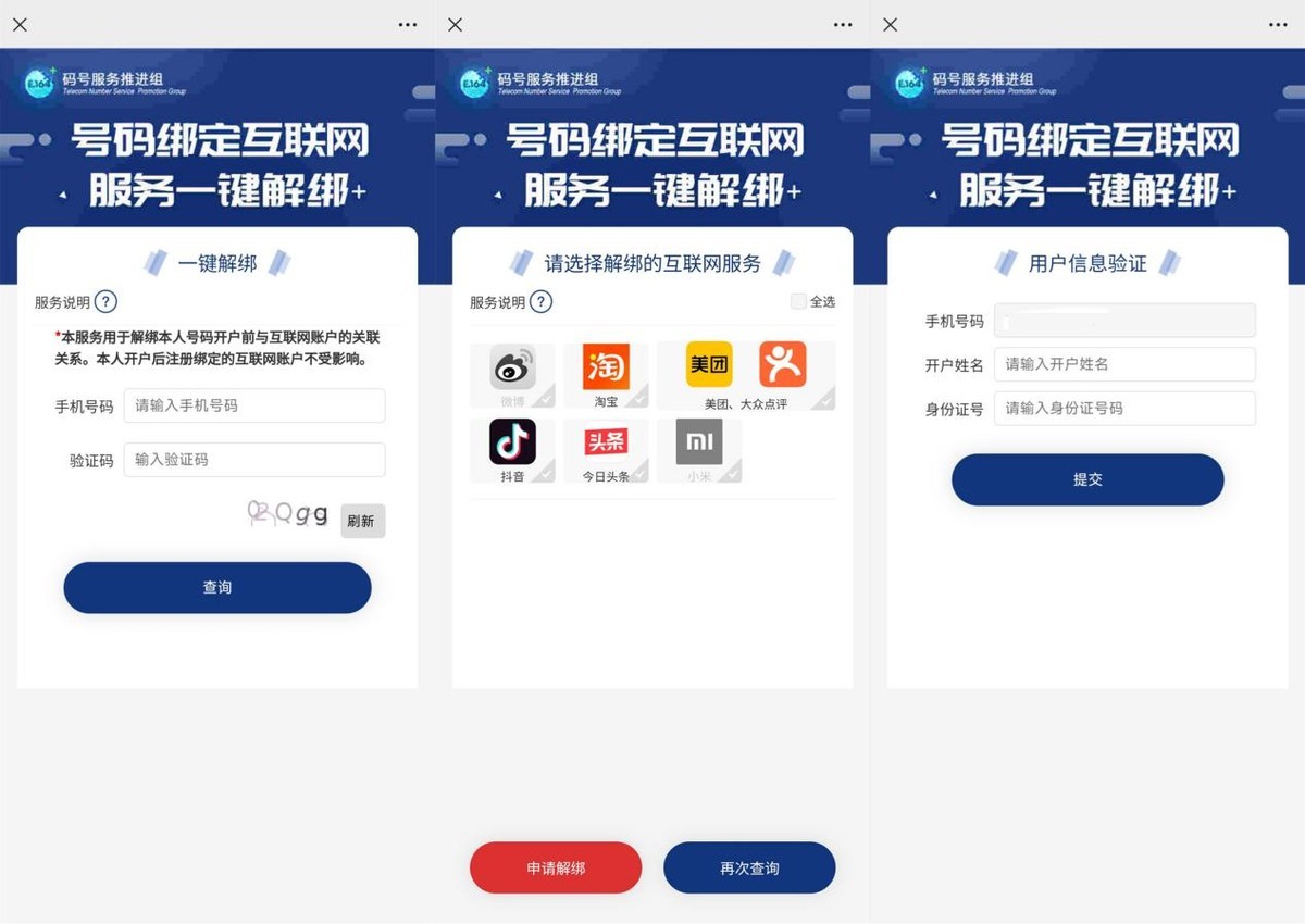 在服务页面中,输入手机号码及验证码,即可查看支持解绑的APP,APP包括微博、淘宝、抖音等。我们选择想要解绑的APP,进行身份验证,即可快速解绑。