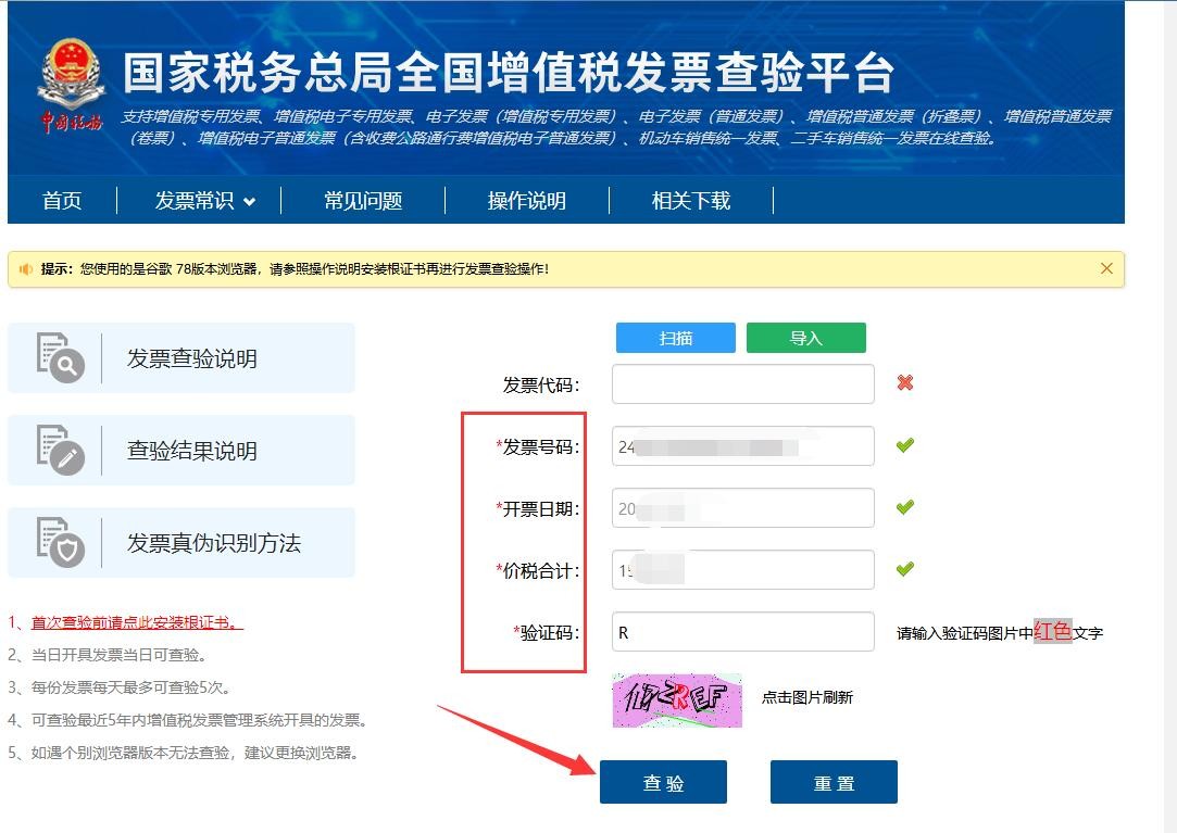 方法一、进入国家税务总局增值税发票查验平台,手工输入电子火车票号码、开票日期、价税合计金额、校验码后,手动点击查验。发票正常的话,将显示票据全部信息;