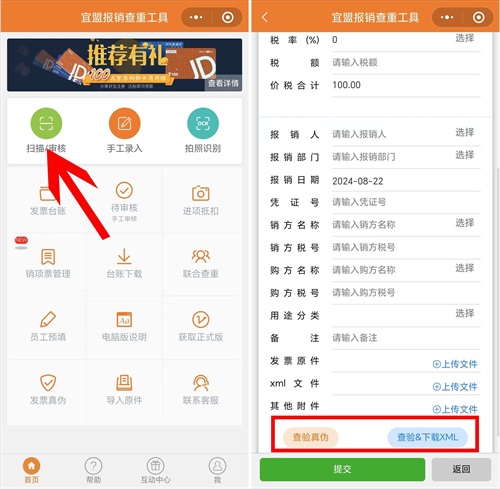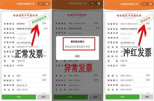 方法二、财务打开《宜盟报销查重工具》,配置了真伪功能后,直接点击【扫描/审核】,扫一下发票二维码,系统自动查重,然后点击【查验真伪】按钮,将验证该张发票真伪,从国税获取发票当前状态。