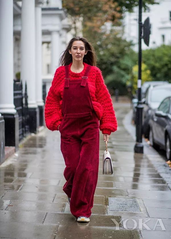 红色本身够明艳抢镜,加上背带裤的减龄感,不仅是拉长比例的神器,还和灯芯绒面料叠加一起更加Chic!