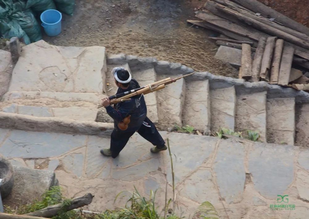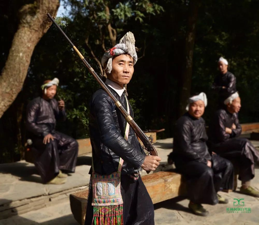 这里的男人头顶挽有发髻,穿着自织的土布衣裤,挎着腰刀,肩扛火药枪,很有武士风。