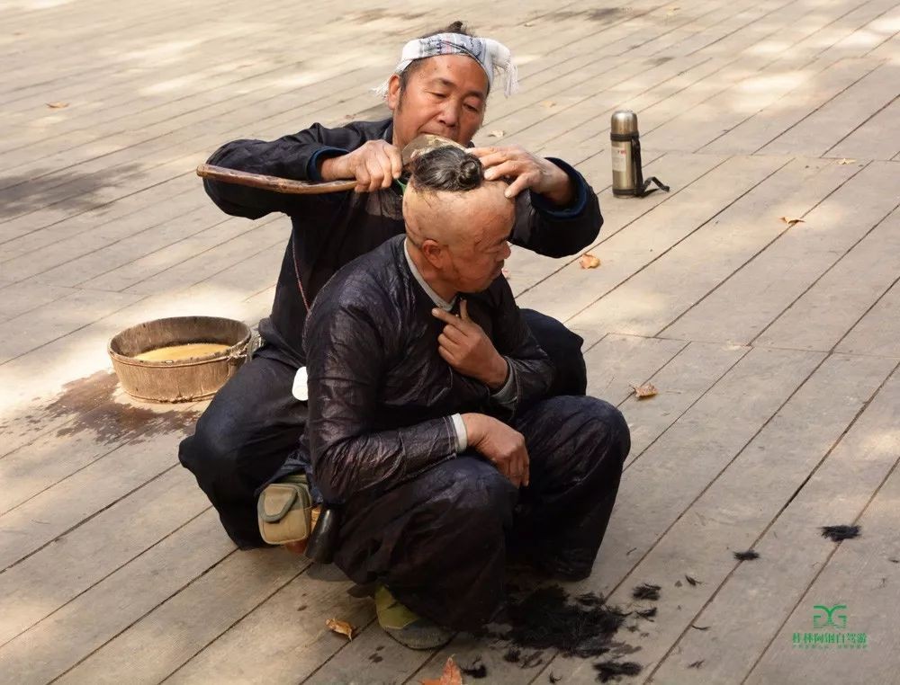 镰刀剃头挺有意思,它是岜沙人授予成人之礼的一种古老习俗。寨中长老用镰刀给男子剃头,剃掉周围头发,留下头顶一撮,并盘发为鬏髻,额头勒上挑花布巾。这个发髻,在岜沙苗语中称为“户棍”。