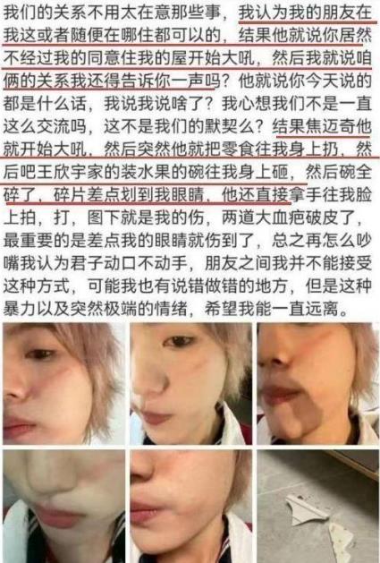 近期,焦迈奇被尹毓恪曝出动手打人,尹毓恪还晒出了自己被焦迈奇打伤的照片,据尹毓恪发文称,当时焦迈奇、尹毓恪和王欣宇三个人在王欣宇家,由于当天焦迈奇之前和薛明媛有些不愉快,心情不好。