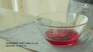 在碗里倒入80g蔓越莓汁和14g明胶