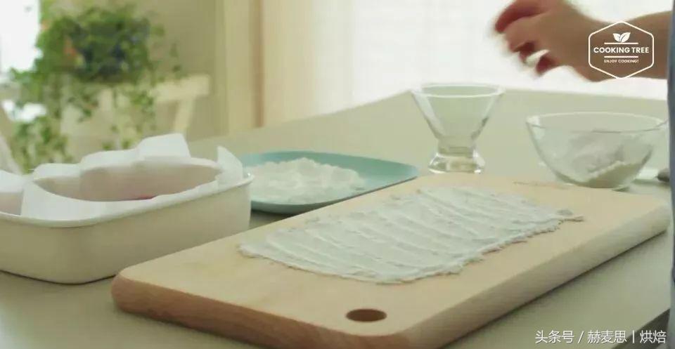 我们在托盘上扑上烘焙纸,再撒入适量糖粉