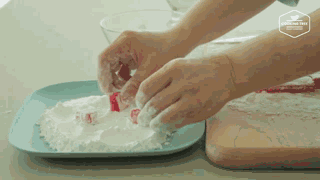 接着把凝固好的软糖倒进粉上