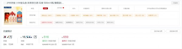 泸州老窖白酒中比较畅销的商品是这款“六年窖头曲52度浓香型白酒”,在京东平台今年累计销售超26万件,累计销售额超1.6亿元。泸州老窖这款白酒整箱装(6瓶)的历史最低价低至516元,最高为659元。