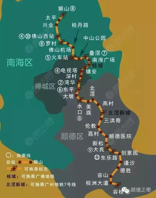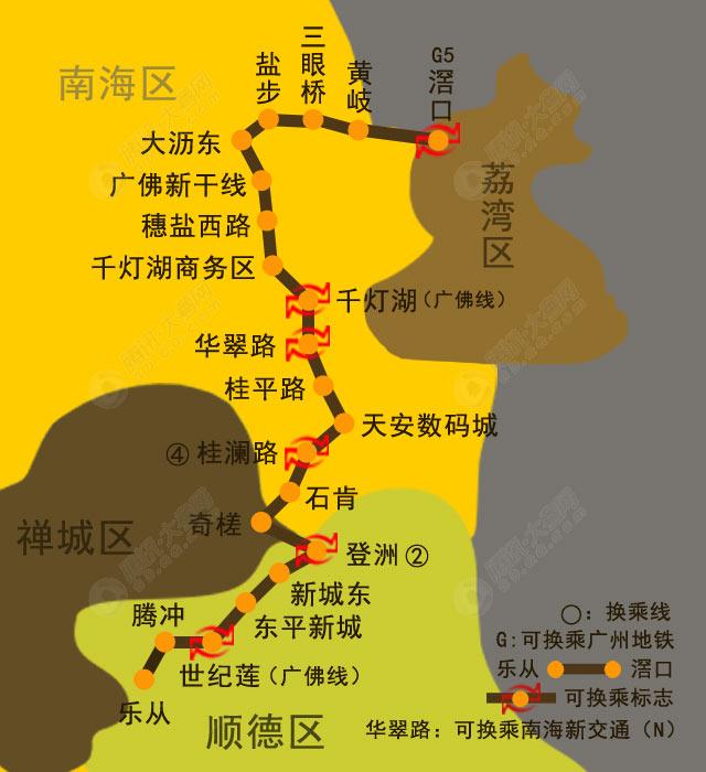 5号线途经乐从、江湾、佛山火车站、大沥、黄岐,联系狮山组团、大沥组团和中心组团。