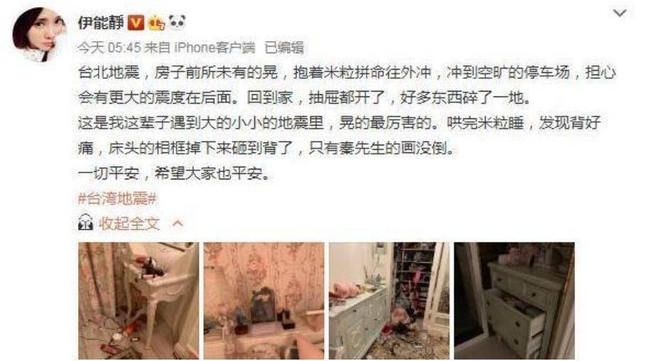 伊能静在台北时就遭遇过地震,许多东西都碎了一地,房屋晃动严重,她很害怕,不过还是优先哄米粒睡觉。