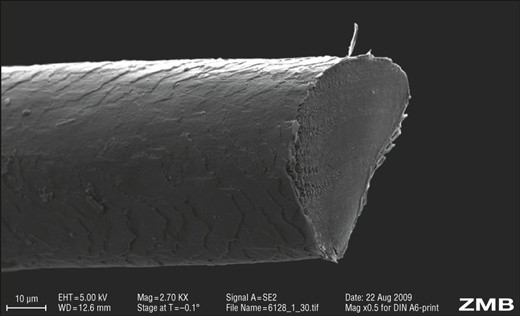 在皮肤镜检查和电子显微镜(分别为×10和×600原始放大倍率)下,可发现直发横截面是圆形的,而卷发是倾斜的,而且蓬发的横截面往往是三角形或心形,且从发根到发尾带有纹理,出现纵向切槽。