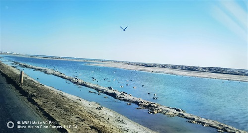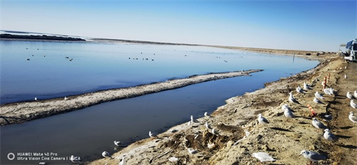 湖中成群的鸟类,有的在湖面幽静地游着,有的在湖边欢快地觅食,有的在湖上高傲地飞翔,水天一色,万物生辉。