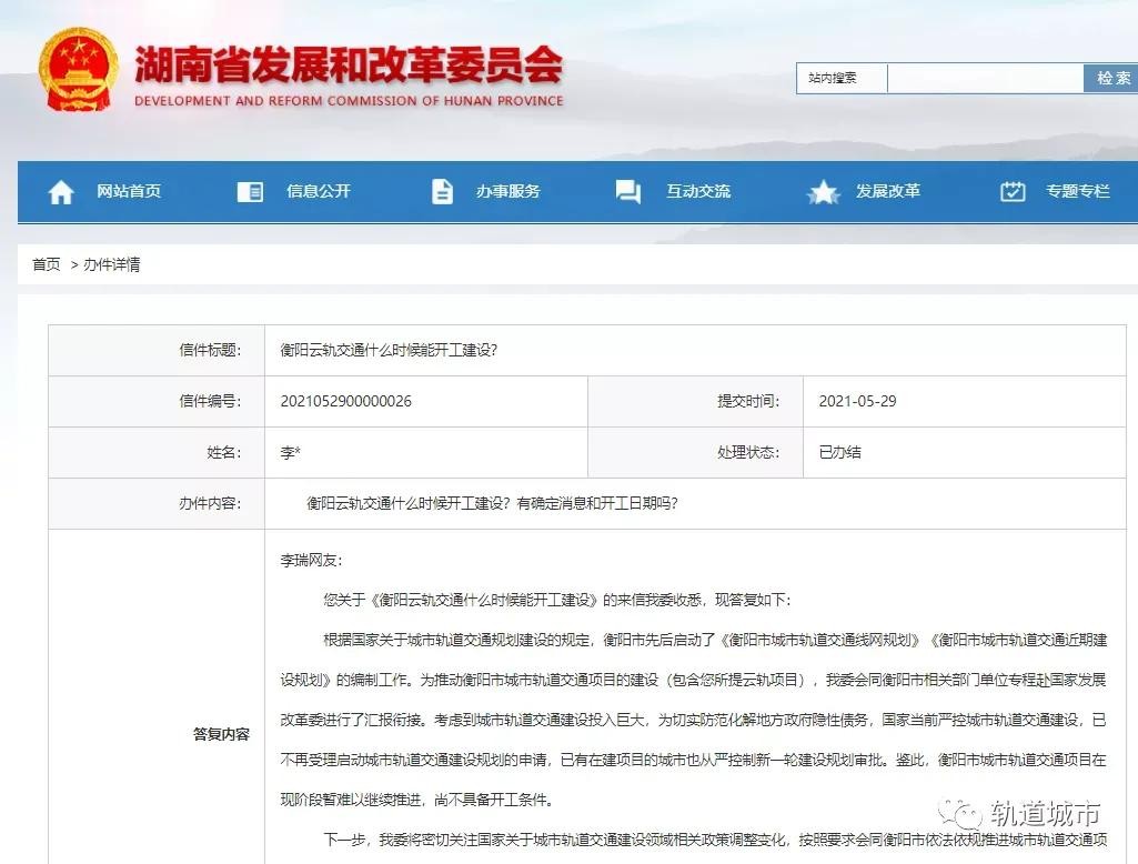 这条官方回复是针对衡阳轨道交通的,回复内容显示,国家已经不再受理启动城市轨道交通建设规划的申请(即首轮规划),已有地铁的城市从严控制新一轮建设规划审批。