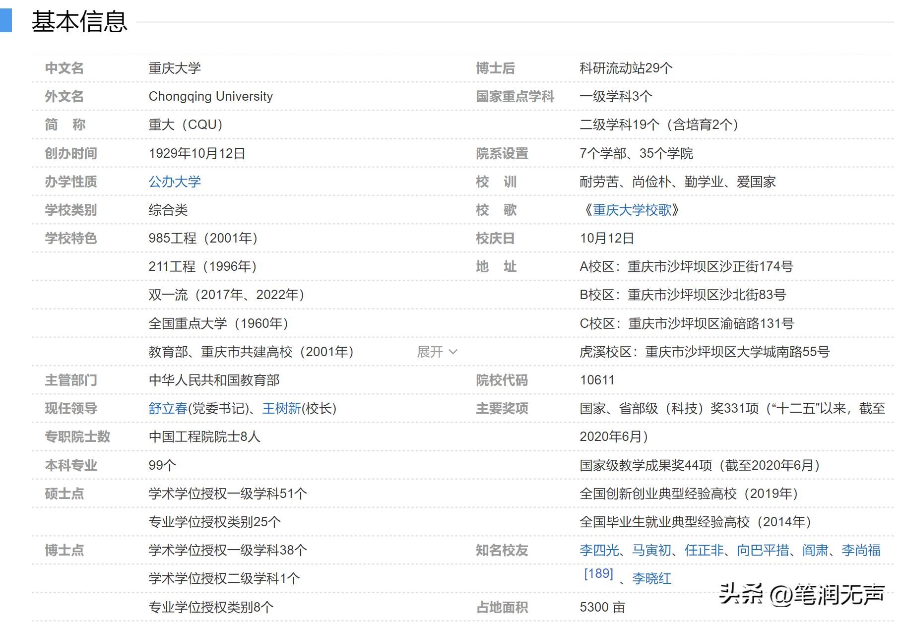 截至2023年6月,学校有A校区、B校区、C校区、虎溪校区和两江校区,校园占地面积5300余亩;设有7个学部、35个学院及7所附属医院,开设108个本科专业 [202] ;拥有一级学科博士学位授权点38个、博士专业学位授权点8个,一级学科硕士学位授权点51个,专业硕士学位授权点25个;有教职工5300余人,其中专任教师3200余人;在校学生50000余人,其中研究生24000余人,本科生26000余人。