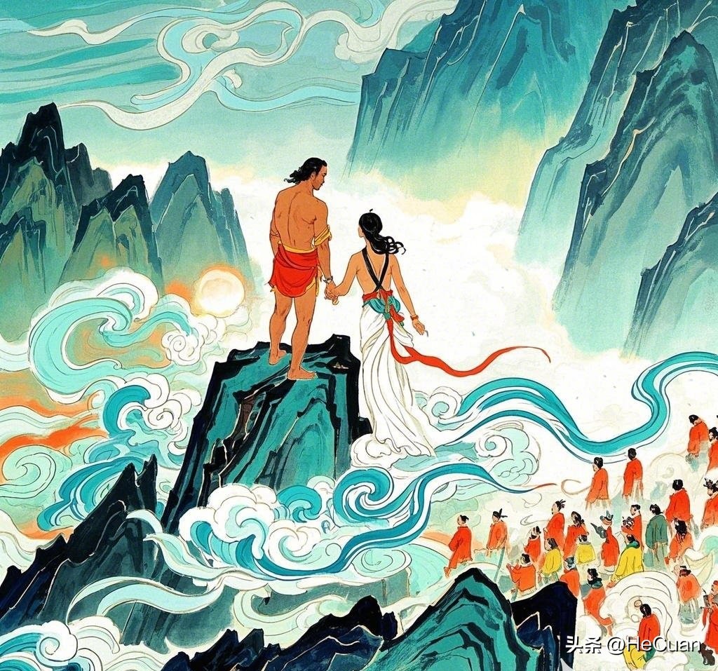 然而,好景不长,一场突如其来的灾难打破了昆仑山的宁静。一场大洪水席卷了整个大地,汹涌的洪水如猛兽般吞噬着一切,房屋、树木、山川都被淹没在水底,人类几乎灭绝,整个世界变得荒凉而死寂。 伏羲和女娲凭借自己的智慧和勇气,在洪水中幸存下来。他们躲在昆仑山的一处山洞中,躲避洪水的侵袭。在这个过程中,他们目睹了洪水带来的巨大破坏,内心充满了悲痛和无奈。他们意识到,如果没有人采取行动,人类将从此绝迹,大地将永远沉寂。