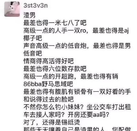 我觉得渣男锡纸烫,渣女大波浪,更多的是一种情感调侃,每个人身边都会遇到很多渣男渣女的故事,通过抖音得网络平台让大家更好的找到共鸣之处,渣男联名追,渣女踩Aj,渣男锡纸烫,渣女大波浪,绿茶椰子堆,炸鸡配百威,而我不一样,一生只爱匡威~~~