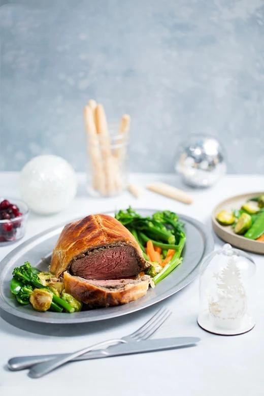 6. 为出炉的威灵顿牛柳轻盖上锡纸,然后放在室温静置 15 至 20 分钟,锁住肉汁。