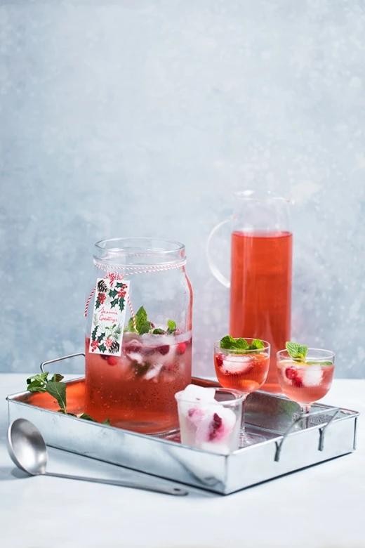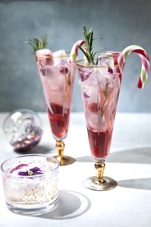 材料:Gin酒(180毫升)、红莓汁(240毫升)、青柠2个(榨汁)、Tonic水(240毫升)、红莓果、迷迭香、士的糖、冰、食用花(装饰用)
