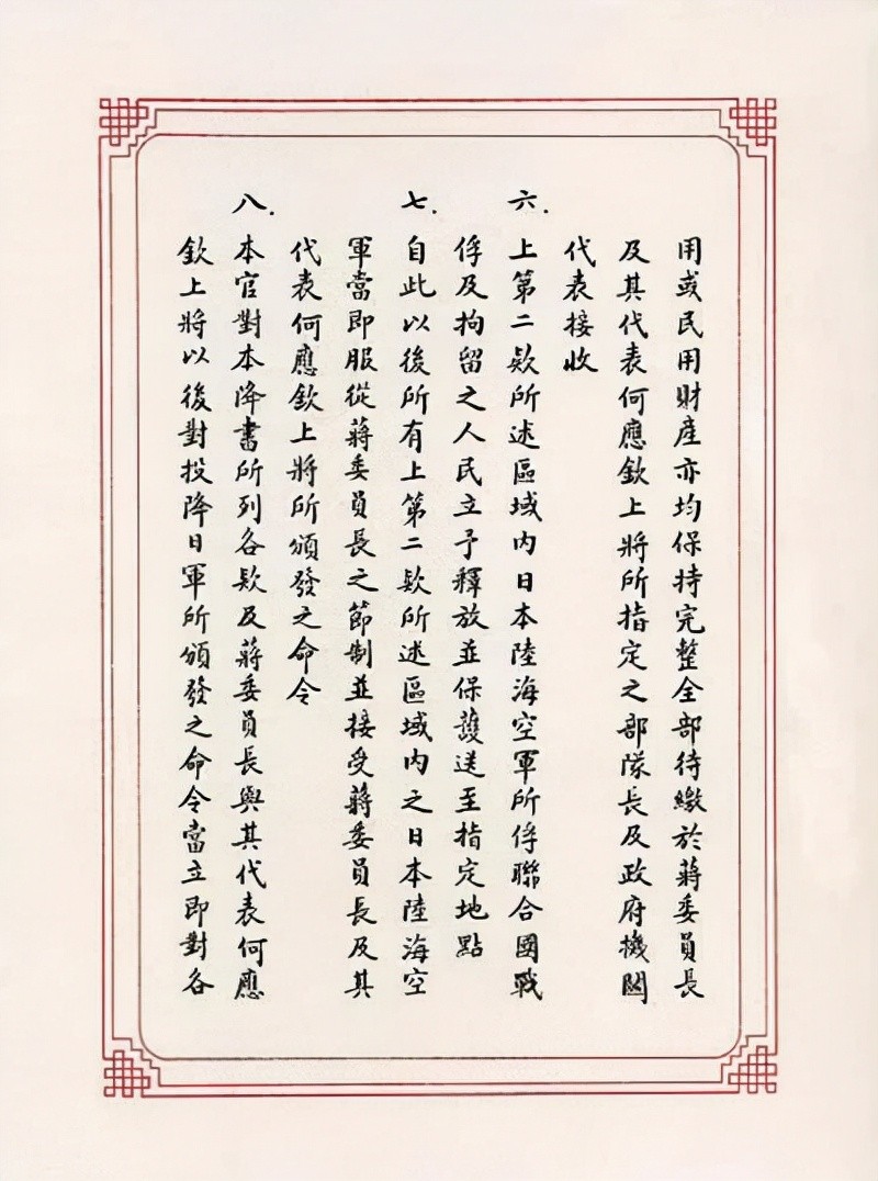 八、本官对本降书所列各款及蒋委员长与其代表何应钦上将以后对投降日军所颁发之命令当立即对各级军官及士兵转达遵照上第二款所述地区之所有日本军官佐士兵均须负有完全履行此项命令之责