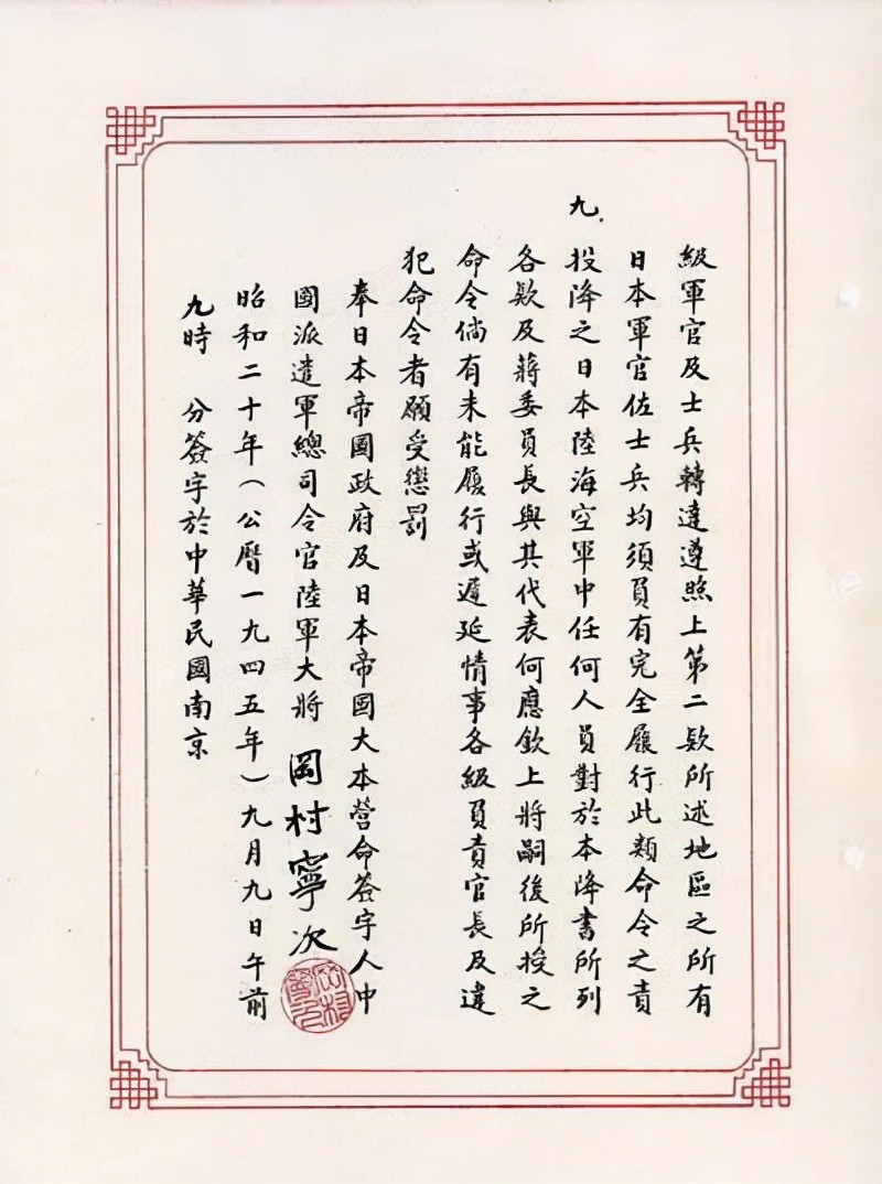 奉日本帝国政府及日本帝国大本营命签字人中国派遣军总司令官陆军大将冈村宁次