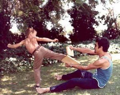 李小龙教授儿子练功。同李小龙一样,李国豪没有逃脱非自然死亡的悲剧宿命。