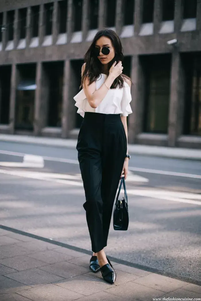 荷叶边元素一直都是小女生的最爱,带有特别甜美的公主和梦幻的感觉。搭配一条黑色高腰烟管裤,显示出腰臀线条,本身利落帅气中又加入了梦幻可爱,也是十分的减龄好看。