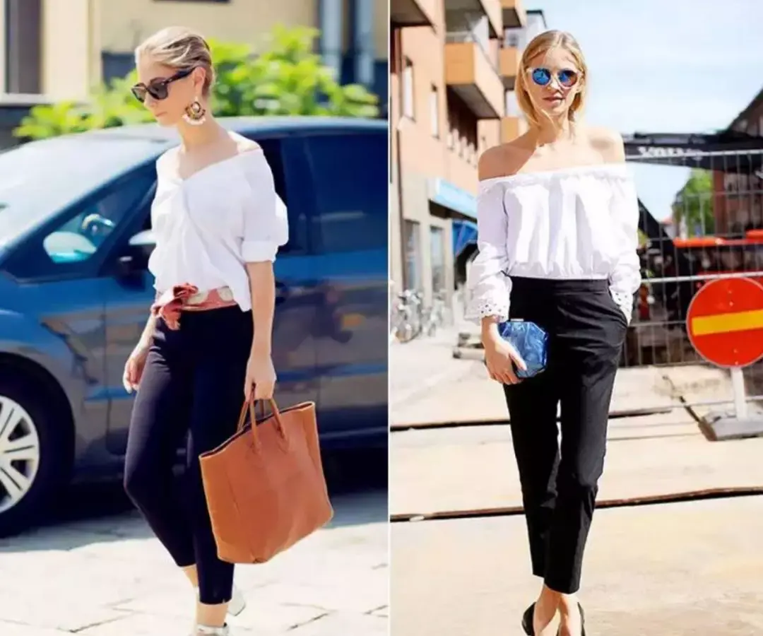 用它来搭配一些设计感的白衬衣,就更加能凸显女性优雅气质,就像一字肩的设计,露出肩颈线条温婉娇美。偏修身又简洁的裤子,搭配起来浑身也透着清爽劲儿。