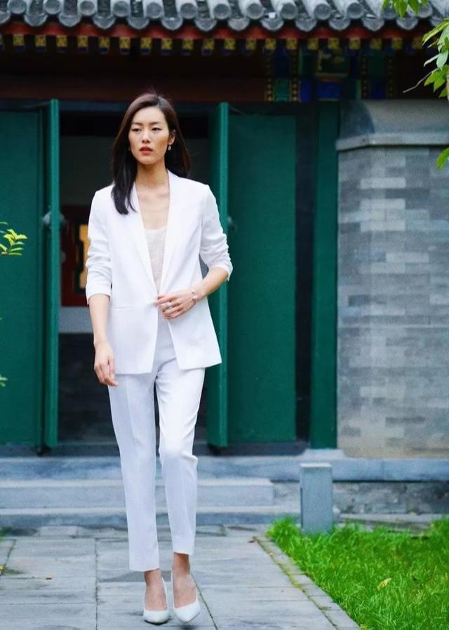 搭配休闲一点的上衣就更加舒适,就是套装上衣选择偏休闲的款式结合烟管裤穿起来不会刻板严谨,搭上T恤就更加活力而随性了。除了深色,像这样一身白色就很御姐范儿。