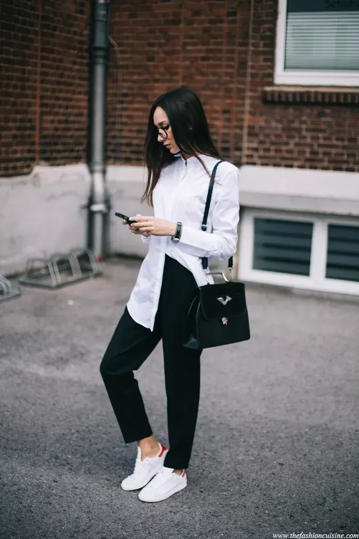 首先推荐用烟管裤来搭配衬衣,如果是黑色的裤子那么白衬衣就是绝佳的搭配,黑白极简利落,本身裁剪简洁的裤子与同属性衬衣,更加凸显干练气,搭上小白鞋上班工作就很得体。